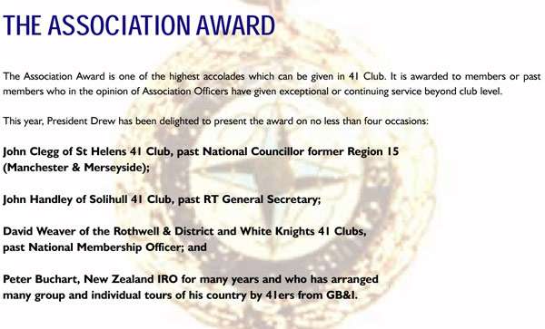 Awards HOME PAGE | HISTORY | OFFICERS | AGM | MEMBERS | LINKS | INTL. RELATIONS | TOURS | RTNZ | REGISTER | FEEDBACK